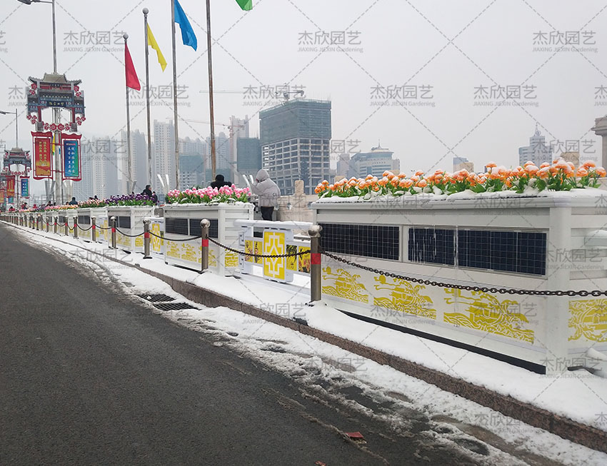 這款智慧花箱,外型設(shè)計由花箱、護(hù)欄組合,雅典白金色調(diào),增添古典氣息,發(fā)光圖案取自“春江花月夜”,充滿詩情畫意,增強(qiáng)了城市風(fēng)景的大氣感。