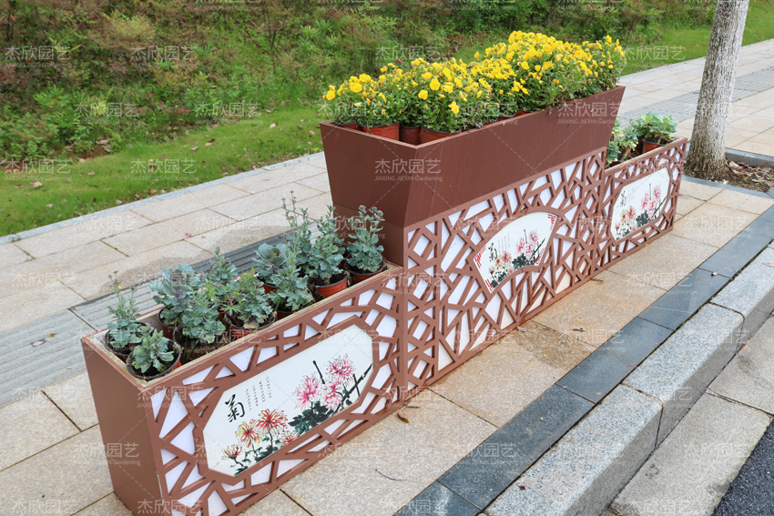 以菊色窗景花箱為例,采用菊文化元素,以窗景造型為特色,表現(xiàn)出濃厚的歷史文化傳承。鏤空造型呈現(xiàn)出的虛實(shí)相生,古典畫面呈現(xiàn)的意境悠悠,無不展現(xiàn)出城市的深厚文化。