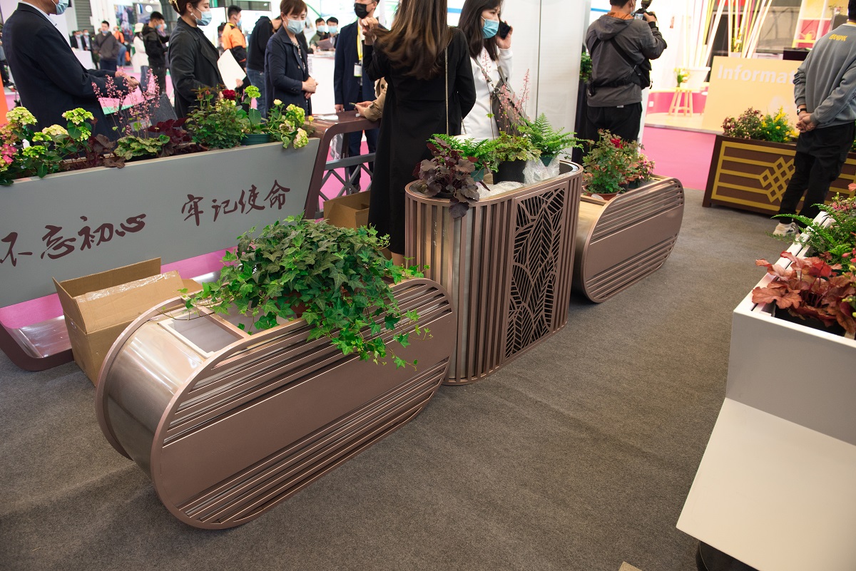 在W5館展位中,杰欣園藝的鈑金花箱以靚麗的外觀、多彩的造型、領(lǐng)先的設(shè)計(jì)理念,分外引人注目。不少人駐足欣賞、拍照,咨詢了解花箱使用場(chǎng)景、材質(zhì)和性能特點(diǎn)。