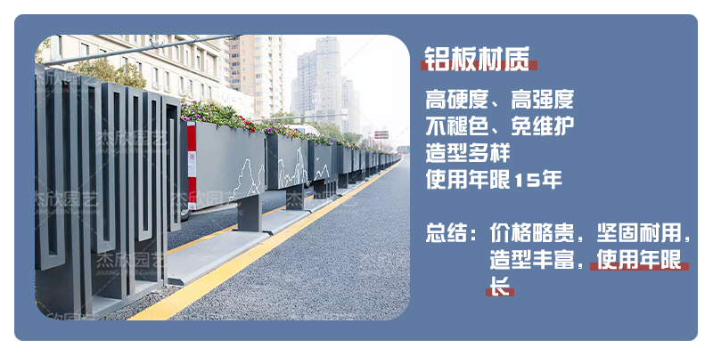 Pvc花箱、鋁合金花箱、鋁板花箱都是常見的花箱材質(zhì),隔離帶花箱更推薦鋁合金花箱、鋁板花箱,使用年限更長、更耐用。