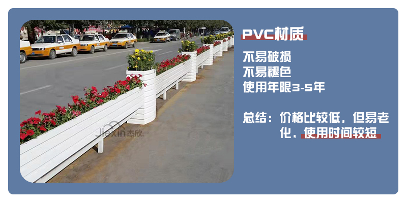 PVC花箱使用年限較短,隔離帶花箱一般建議采用鋁合金或鋁板材質(zhì)。