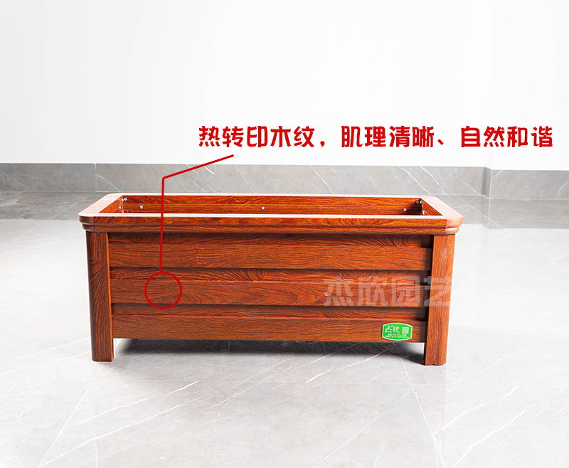 鋁合金花箱的木紋色是熱轉(zhuǎn)印覆膜生成,肌理美觀度高,好的木紋色就是肌理清晰,紋路自然蔓延。上手光滑細(xì)膩,無顆粒凹凸。