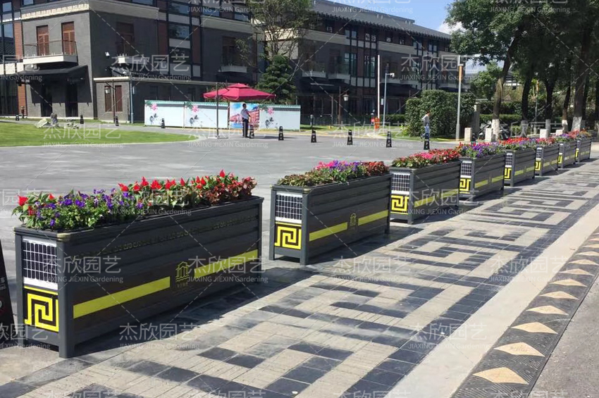 這款智慧花箱,外觀高級灰,金色點(diǎn)亮主體,大氣沉穩(wěn)又不失新穎。夜間亮化效果與整體夜景融為一體,美輪美奐。