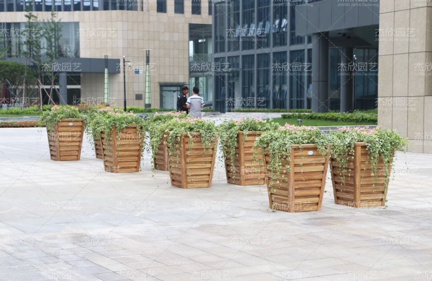 景觀效果:黃檀木色花箱,梯形的外觀,排列組合,搭配綠植,起到了景觀的裝飾效果。