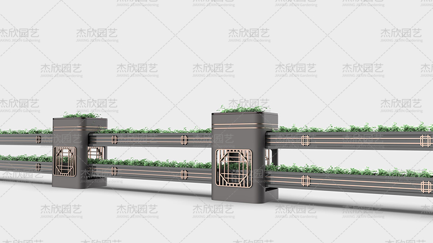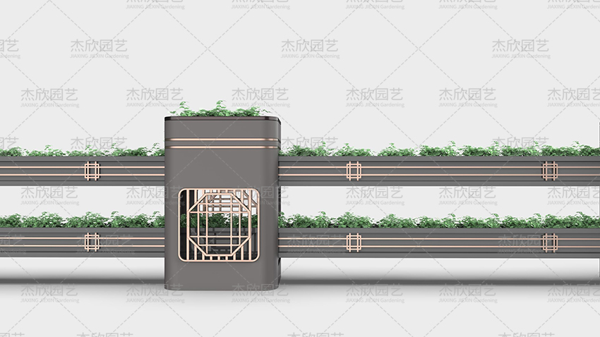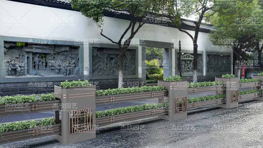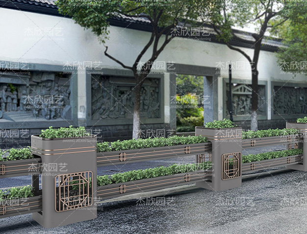園林是中國建筑美的杰出代表,也是中國人對人居環(huán)境的詩意闡述。園林寄托著人們對美好生活的向往。園林藝術(shù)在當(dāng)代設(shè)計(jì)中也屢見不鮮,并深受喜愛。這組道路花箱將園林之中的窗格藝術(shù)之美融入其中,取其神,去其形,用現(xiàn)代手法表現(xiàn)出祥瑞之意。