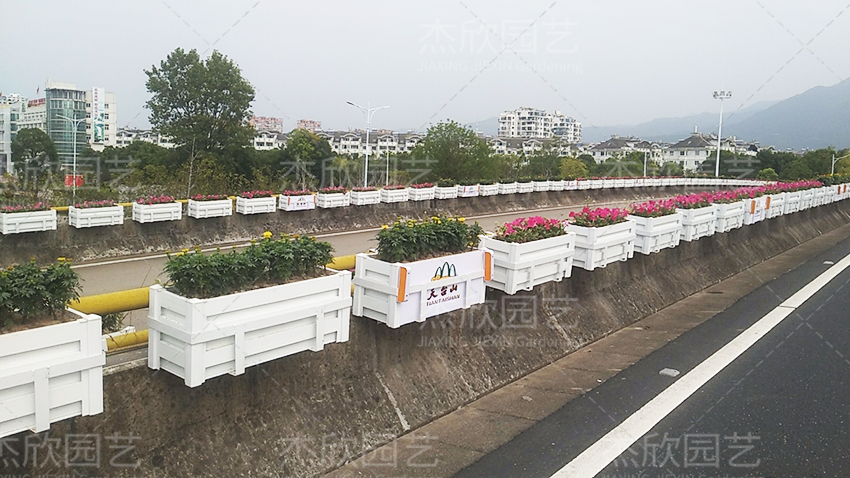 1、懸掛式花箱。懸掛式花箱安裝便利,只需要安裝在橋梁的護欄上即可。懸掛式花箱規(guī)格較小,花箱與花箱間距合理,能夠呈現(xiàn)出相當不錯的橋梁景觀?;ㄏ漕伾x擇以白色居多。